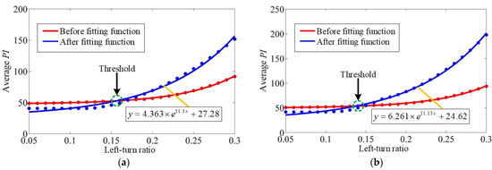 Figure 7. Average PI under different left-turn ratios. (a) Arrival rate is 0.07 pcu/s, (b) Arrival rate is 0.08 pcu/s.