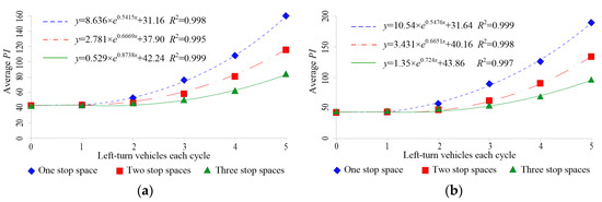 As shown in Figure 8, the more stop spaces in the LWA, the lower the average PI in the same traffic conditions. When the space in the intersection is sufficiently large and the LWA can store more left-turn vehicles, the operation performance of the LWA intersection in this study may be better than that of the four-leg signalized intersection with a left-turn dedicated lane and a left-turn phase, because it reduces one phase and shortens the cycle. Once the arrival number of left-turn vehicles in each cycle exceeds the stop spaces in the LWA, the average PI will increase rapidly, mainly due to the queuing of left-turn vehicles and the failure of through and left-turn shared lane.