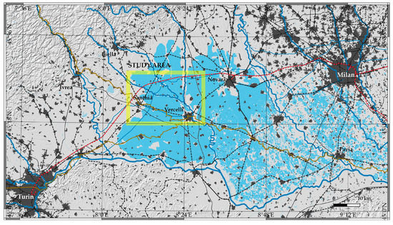 Map of the rural landscapes of paddy-rice fields in between Turin and Milan. The map highlights the hydrographic network that supports rice cultivation. The map has been generated by integrating geographical datasets from the Piedmont and Lombardy regions. The yellow rectangle highlights the study area, between Vercelli and Santhià, that has been analyzed.