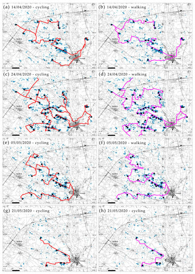 Maps of cycling itineraries (a,c,e,g) and foot walking itineraries (b,d,f,h) over the spring season in 2020, drawn by the algorithm. The overall image shows how slow tourism itineraries can be automatically drawn according to seasonal landscape changes. For each selected date of Sentinel-2 data acquisition, a slow tourism itinerary for cycling and foot walking travel mode has been drawn according to the flooding of paddy-rice fields. By observing the maps, the variation of the spatial distribution of the flooded paddy-rice fields is visible date by date, as is the parametric adaptation of the itineraries to the temporary landscape condition. The black dots are the main hotspots extracted by the heat maps of the flooded paddy-rice fields that have been used as anchor points to draw up slow tourism itineraries. The algorithm can be run for each Sentinel-2 data acquisition. Technical data about the examined itineraries are shown in Table 1, which highlights the route percentage along the flooded paddy-rice fields.