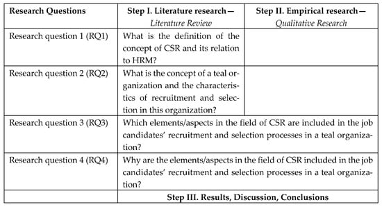 The aim of the research presented in this article was to identify the aspects of CSR in the job candidates’ recruitment and selection processes in a teal organization and the motives of CSR implementation in these processes. The ISO 26,000 standard was used as a model to search for CSR aspects in the recruitment and selection processes in a teal organization. For the purpose of conducting the literature and empirical research, four research questions were formulated. The conducted research process is presented in Figure 1.