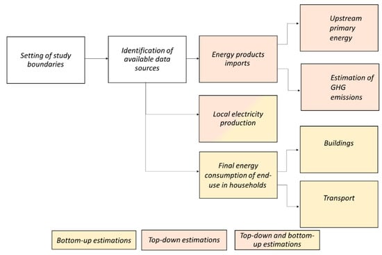 Taking the final energy data, the upstream primary energy linked to the energy imports is calculated, so as to obtain the quantification and characterization of the total energy supply (TES) (Section 2.5.3). Finally, the GHG emissions produced due to the final energy consumption are also calculated with the help of sectorial carbon intensity factors (Section 2.5.4).