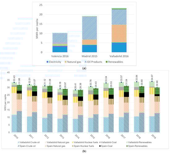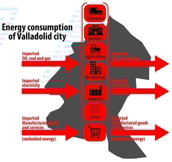 There are multiple methodologies and approaches to analyze the energy consumption of a city [15]. We take one physical approach for the final energy consumption user, as in the reference work for Melbourne [16]. This approach has recently been used for two larger Spanish cities: Madrid [17], in which an energy balance is carried out with top-down data sources, and Valencia [18], in which a combination of top-down and bottom-up methodologies are used to solve the lack of data. There are other methodologies to describe the final energy consumption, adopting only a bottom-up approach [19,20,21,22]. In addition, there is a wide range of methodologies linked to the urban metabolism discipline [23,24], which is combined with a social activity analysis [25,26] or other sustainability indicators [27,28,29]. On the other hand, there is also a consumption approach that has similarities with the consumption area based on carbon footprint methodologies [30,31,32]. That kind of analysis usually takes economic input–output data instead of energy physical flows [33,34].