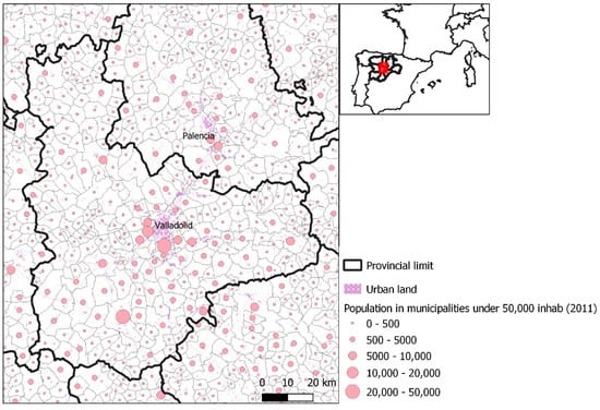 The city of Valladolid has a municipal area of 197 km2, of which 75% is rural land, and has around 300,000 inhabitants. Furthermore, the rest of the province (~500,000 inhabitants), although it is mostly rural, has several large municipalities (over 20,000 inhabitants) [43]. Some of these municipalities are located on the periphery of the city of Valladolid (Figure 3), forming a functional urban area. Laguna de Duero, south of Valladolid, has been a municipality of more than 20,000 inhabitants for decades. Arroyo de la Encomienda has also become a large municipality in the last decade, which has grown by 30% to reach 20,000 inhabitants. The urban area that surrounds Valladolid is home to about 20% of the population of the province that does not reside in Valladolid. In total, the functional urban area (Valladolid and periphery) accounts for almost 80% of the population of the province with ~400,000 inhabitants [44].