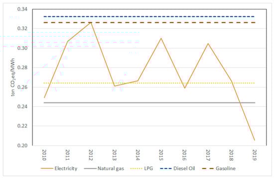 Regarding the distribution by upstream primary energy, the vast majority of the energy products are from fossil fuels (crude oil and natural gas represent between 70% (2015) and 78% (2010) of primary energy sources). As is shown, biomass consumption multiplied by a factor of 3.45 between 2014 and 2016, due to the district heating installation service of the University buildings [46]. That increase has no clear correspondence with a reduction in other fuels in the whole city overview, despite the large natural gas consumption reduction achieved in the university (a reduction of 76% between 2011 and 2019) and the elimination of the use of heating oil.