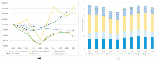 Regarding the sectorial final energy consumption, Table 7 indicates the relevance of the industry in the city. In addition, this consumption went from representing 25% to 34% throughout the decade. On the contrary, residential consumption has significantly and steadily decreased its consumption throughout the decade, falling by 29% at the end of the decade.