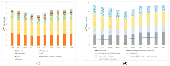 Temporal results. (a) Evolution of main indicators with relation to 2010 in %. (b) GHG year emissions by sector (ton CO2eq per capita). (c) TES by year and energy source (MWh per capita). (d) Final energy consumption by year and sector and local energy production (losses are excluded) (MWh per capita).