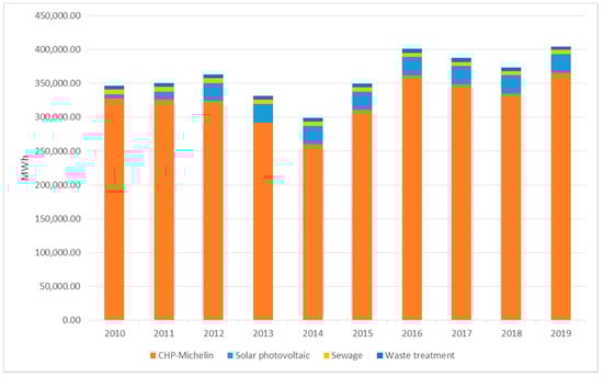 - For the Michelin power station (Energyworks VitVall PlantValladolid, Spain), due to the fact that it is the only major consumer in the town, its electricity production could be estimated with its performance characteristics (0.39 MWh of electrical output for each 1 MWh of natural gas supply [53]) and gas consumption data from the distribution company. We could test that data with the emissions reported in the UE-ETS database [53].