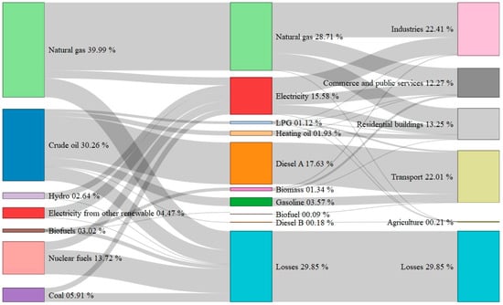 We calculated the upstream primary energy imports from the data collected as energy product imports (Section 2.5). Based on these data, we applied different conversion factors provided by [64] (see Table 4). For the electricity factor, it was assumed that the energy is distributed with a low voltage. For the rest of the products, the most representative categories were selected. It was assumed that, throughout the decade studied, there were no relevant technological changes that led to modifications in the conversion factors from primary energy to final energy, so they were taken as constants.