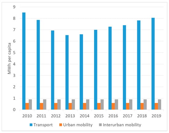 First of all, the study is temporally and geographically limited. A ten-year time range is chosen with annual data as a sample. In the case analyzed, considering data availability, the decade 2010–2019 was chosen. Secondly, the approach is area-based. This second delimitation implies some complications with diffuse energy uses, among which transport stands out, due to the relationship with the rest of the functional urban area and also to the importance of being a transport transit hub. In order to identify the transport energy consumption, the interurban mobility is taken as inner energy consumption only for the road modes, which can refuel in the city area. Therefore, it is assumed that the energy imports to the reference area are the main indicators of the final consumed energy; this is also true for the transport sector. In addition, it is the main data source to estimate the GHG emissions due to local activities.