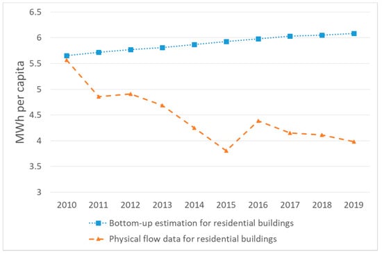 After obtaining the general perspective of the energy flows consumed and their sectorial breakdown from a top-down perspective, we estimated the energy directly consumed by the households following a bottom-up approach (Section 2.6). The purpose of this estimation is to identify the energy demand due to the households in order to prevent an eventual overestimation from the top-down perspective to this sector. To do so, we provided two calculations with a bottom-up methodology to obtain, firstly, the energy consumed in the residential buildings and, secondly, the energy consumed by the mobility of the resident population. For the first one, there are many models [40], and there is abundant official data at our study case level concerning this subject (cadastral data [41]), which allows acceptable results to be obtained. On the other hand, for transport, there are far fewer models and information sources. Although the transport consumption calculation could be based on the existing vehicle fleet (on which there is abundant information), there are important differences between this fleet and its actual use [42]. That is why we opted for sources that describe personal mobility to estimate energy consumption, which is another novel method developed for this work. In this regard, we found two types of sources: urban mobility surveys and interurban mobility surveys or databases. It is not usual for these data sources to directly collect energy consumption estimates; thus, it is necessary to make estimates, as we did in this case.