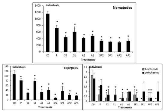 Abundances of meiobenthic taxa from uncontaminated (C0) and contaminated (P; S2; S1; A2; A1; SP2; SP1; AP2; AP1) microcosms. (*) above bars indicate significant difference (p < 0.05).
