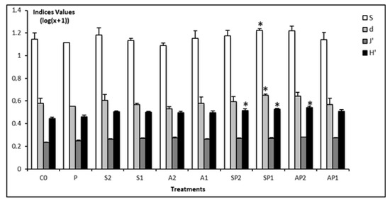 Graphical summary of univariate indices for nematode assemblages from each microcosm. H’ = Shannon-Wiener index, d = Margalef’s species richness, J’ = Pielou’s evenness, S = species number. An asterisk above bars indicates a significant difference (p < 0.05) with the control community (C0). (*) above bars indicates significant difference (p < 0.05).