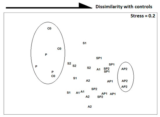 The nMDS output indicated a significant effect induced by S, A, and P alone or by their mixtures on species distribution within the ordination space (stress = 0.2). The AP2 treatment was most dissimilar compared to C0, whereas the P community was the closest to control (Figure 3).