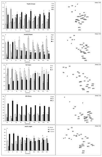 Non-metric multidimensional scaling (nMDS) 2D plots (right) and graphical summary (left) based on abundances of functional groups of nematode assemblages from each microcosm. Selective deposit feeders (1A); non-selective deposit feeders (1B); epigrowth feeders (2A); omnivores-carnivores (2B); short/round (s/r); elongated/filiform (e/f); conical (co); clavate/conical-cylindrical (cla); spiral (SP); pocket-like (Pk); indistinct (Id); circular (Cr). An asterisk above bars indicates a significant difference (p < 0.05) with control community (C0).