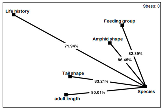 The nMDS second-stage ordination showed that the responses of nematode species to the different treatments depended mainly on their shapes of amphids (86.45%), tails (83.21%), and composition of trophic guilds (82.39%) (Figure 5).