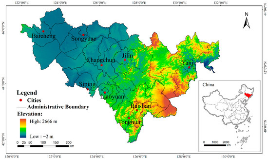 In this paper, the land use status data in Jilin Province in 1998, 2008 and 2018 were provided by Jilin Institute of Land and Resources Survey. The elevation data comes from Geographic Science and Resources, Resources and Environment Science, and the Data Center in the Chinese Academy of Sciences Institute (https://www.resdc.cn/data.aspx?DATAID=284, accessed on 11 August 2021) [36]. The social and economic data comes from the “Statistical Yearbook of Jilin Province”, the “Statistical Yearbook of China’s Counties”, the “Statistical Bulletin of National Economy and Social Development of Jilin Province” and the statistical yearbooks of the other cities and states [37].