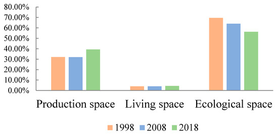 This paper reclassified the land types of the current land use status from 1998 to 2018 based on the PLES land-use classification system of Jilin Province (Table 1), and calculated the area of the production space, living space and ecological space. On the whole, the scale of the ecological space in Jilin Province was the largest, followed by the production space and then the living space. In the past two decades, the ecological space area gradually decreased from 69.57% in 1998 to 56.29% in 2018, and the living space area increased slightly, from 3.95% in 1998 to 4.36% in 2018. The area of the production space did not change much in the first decade, but increased significantly in the last decade, from 31.95% in 2008 to 39.39% in 2018 (Figure 2).