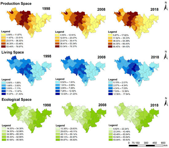 - The ecological space scale was the largest, followed by the production space, and the living space scale was the smallest in Jilin Province. In the past two decades, the ecological space area gradually decreased from 69.57% in 1998 to 56.29% in 2018, and the living space area increased slightly from 3.95% in 1998 to 4.36% in 2018. The production space area showed little change in the first decade of the study period, increasing from 31.95% in 2008 to 39.39% in 2018.