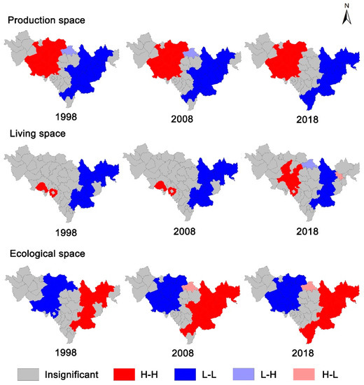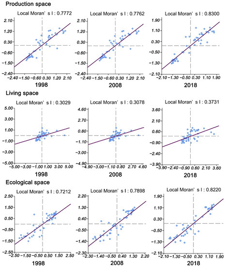 As can be seen from the table above, with a confidence level of 99%, the Global Moran’s I index of the proportion of the PLES in Jilin Province in 1998, 2008 and 2018 was positive, indicating the existence of spatial agglomeration in the PLES in Jilin Province, i.e., both the high-value region and the low-value region had the characteristics of spatial concentration distribution. Judging by the exponential trend, the Global Moran’s I Index of production space, living space and ecological space was positively correlated with the time change, and all of the indices showed an upward trend, which indicated that the Global spatial correlation was gradually strengthened. From the value of the index, the production space and ecological space were much larger than the living space, which indicated that there were more significant spatial agglomeration phenomena in the production space and ecological space. From the range of changes in different periods, both the production space and the living space changed slightly from 1998 to 2008, and the index value changed greatly from 2008 to 2018. However, the index values of ecological space changed greatly from 1998 to 2008, and slightly from 2008 to 2018.