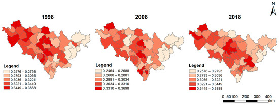 According to the calculation results of the coupling coordination degree model between the two functions constructed in Equations (9)–(12), the results show that the coupling coordination degrees in the counties and districts in 1998, 2008 and 2018 were between 0.24 and 0.39, and there were two types of moderate incoordination and slight incoordination (Table 8). The coupling coordination degrees between the two functions showed that, in 1998, 2008 and 2018, the production–living function coupling coordination degrees were between 0.19 and 0.48. There were four types, i.e., severely uncoordinated, moderately uncoordinated, slightly uncoordinated and on-the-verge-of-uncoordinated. The coupling coordination degrees of the production–ecological function were between 0.22 and 0.41, and there were three types: moderately uncoordinated, slightly uncoordinated and on-the-verge-of-uncoordinated. The coordination degrees of the living–ecological function coupling were between 0.21 and 0.40, and there were two types: moderately uncoordinated and slightly uncoordinated. The evolution of the coupling coordination degrees of some districts and counties showed fluctuation, such as Nong’an County, Shulan City, Tonghua urban area, Yitong County and Tonghua County, from slight to moderate to slight incoordination. However, Yushu City and Changling County experienced a “regression” from slightly to moderately uncoordinated; the coupling coordination degree of the urban areas of Dehui City, Jiaohe City and Baishan urban area improved, from moderately to slightly. The stability of the coupling coordination degrees of some counties and districts over time were slightly uncoordinated or moderately uncoordinated types: areas such as Changchun urban area, Jilin urban area, Yongji County, Huadian, and other 17 counties and districts all belonged to the slightly uncoordinated type; Liuhe County, Ji’an City, Jingyu County, Tumen City, Hunchun City and other 10 counties and districts all belonged to the moderately uncoordinated type.