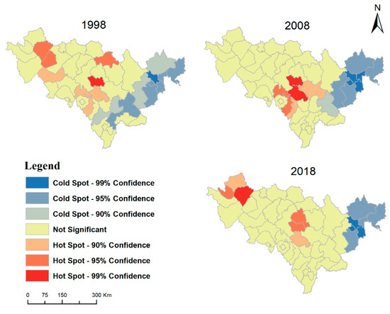 Distribution of the cold and hot spots of the coupling coordination degree in Jilin Province from 1998 to 2018.