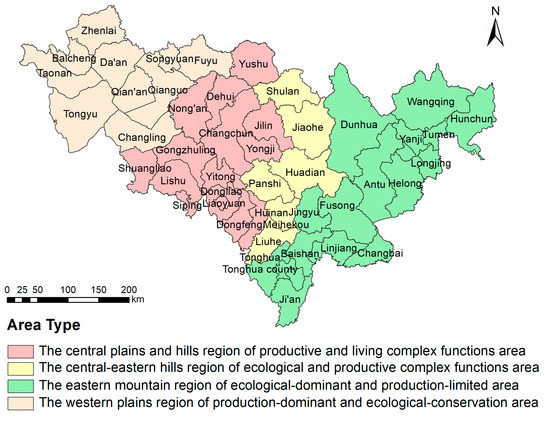 Sketch map of the PLE functions area division in Jilin Province.