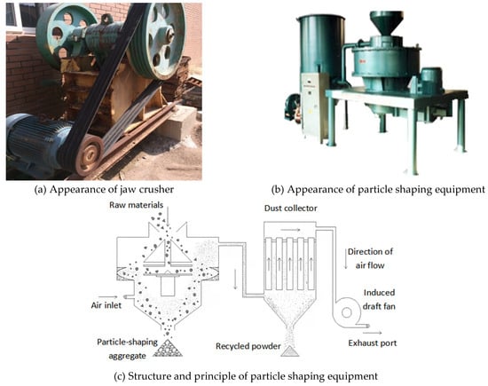(a) Appearance of jaw crusher, (b) appearance of particle shaping equipment, and (c) structure and principle of particle shaping equipment.