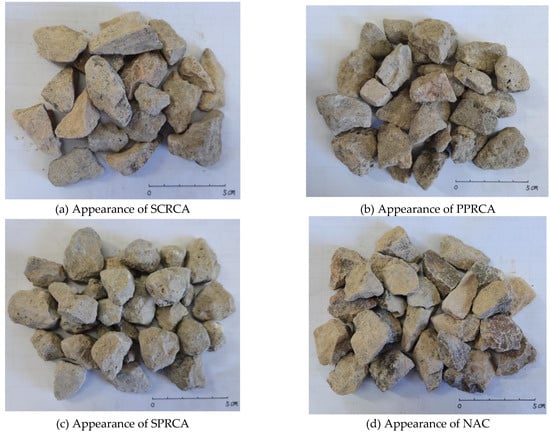 The basic properties of the different grades of RCA in Chinese National Standard GB/T 25177-2010 [] and the basic properties of the three types of RCA are shown in Table 4. In addition, the images of the three different qualities of RCA and NCA are shown in Figure 2, respectively.