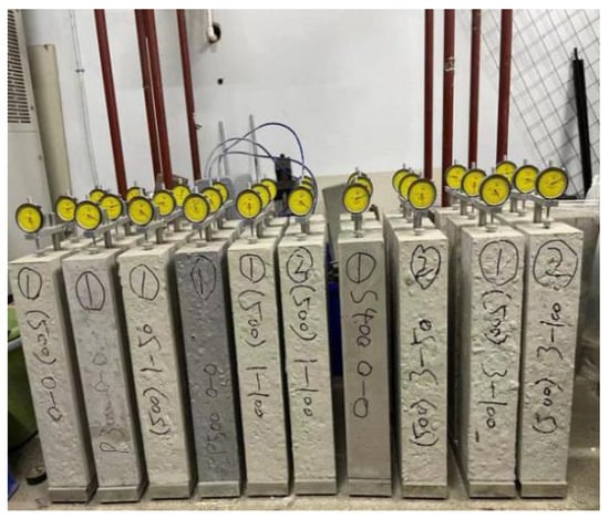 The shrinkage variation values are lower due to the micro-expansion and crack resistance properties of HBSAC. Therefore, the drying shrinkage of green recycled concrete was determined by using a fixed vertical shrinkage and expansion apparatus (Figure 3). The size of the test blocks is 100 mm × 100 mm × 515 mm. The drying shrinkage performance of HBSAC-based recycled concrete applicable to the actual project was investigated by controlling the slump in the range of 160–200 mm, and the data were obtained by using the shrinkage rate calculation formula. The arithmetic average of the three results, taken to an accuracy of 1.0 × 10−6 is the shrinkage of green recycled concrete. The shrinkage of green recycled concrete at different ages is according to the following formula: