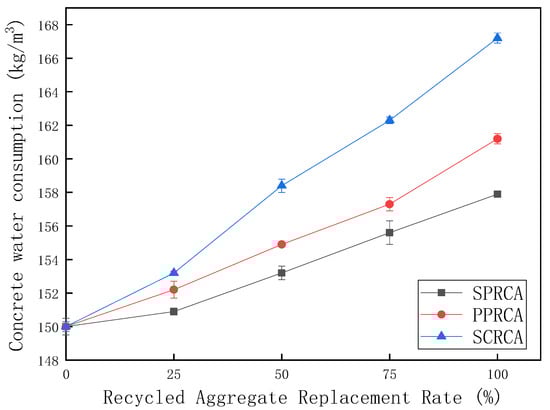 The underlying reason for the difference in water absorption between the different qualities of RCA and NCA is the mortar adhering to the RCA [,]. Compared to the other aggregates, SCRCA is only subject to simple crushing treatment, its particle shape has more edges and corners, and the amount of old mortar and micro powder attached to the surface is much higher than the other two kinds of RCA. The hardened old mortar attached to the surface of SCRCA has high water absorption, resulting in increased water consumption and reduced workability of green recycled concrete. However, SPRCA underwent secondary particle shaping, which effectively improved the particle shape and gradation of the aggregate and reduced the amount of old mortar adhered to the surface of the aggregate, causing its water absorption rate to be significantly reduced compared to the other two types of RCA, and its impact on the water consumption of green recycled concrete is relatively less. In addition, compared with NCA, SCRCA has a higher needle and flake particle content and crushing index, and PPRCA also has a higher crushing index. Therefore, at a certain replacement rate, the water consumption of green recycled concrete is still not lower than NAC.
