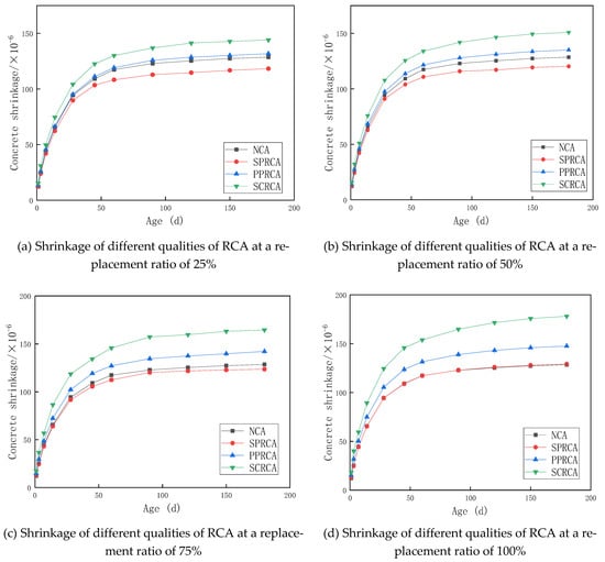 (a) Shrinkage of different qualities of RCA at a replacement ratio of 25%, (b) shrinkage of different qualities of RCA at a replacement ratio of 50%, (c) shrinkage of different qualities of RCA at a replacement ratio of 75%, and (d) shrinkage of different qualities of RCA at a replacement ratio of 100%.