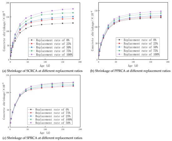 (a) Shrinkage of SCRCA at different replacement ratios, (b) shrinkage of PPRCA at different replacement ratios, and (c) shrinkage of SPRCA at different replacement ratios.