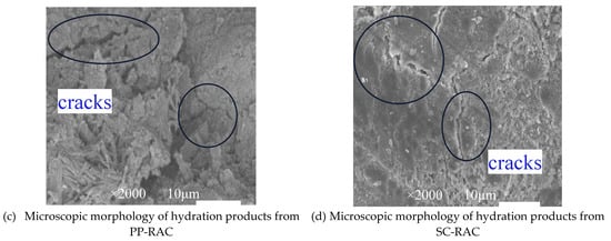 (a) Microscopic morphology of hydration products from NAC, (b) microscopic morphology of hydration products from SP-RAC, (c) microscopic morphology of hydration products from PP-RAC, and (d) microscopic morphology of hydration products from SC-RAC.
