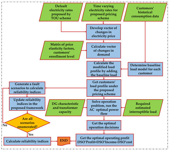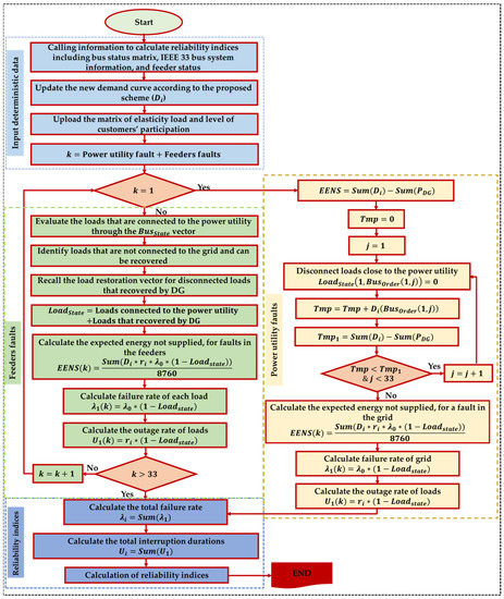 Quantifying the advantages of employing DR for cost studies is essential. In this section, a method is presented for accurate calculation of the effect of implementing DR and describing it as DS reliability indices. In this paper, it was assumed that the daily energy consumption of each customer was fixed. Also, customers’ behavior was optimal; customers transferred their consumption from peak hours to nonpeak hours in response to the proposed tariff. Therefore, implementing the proposed program did not affect the average daily energy of the DS and only decreased the load peak. The general algorithm of the method proposed in this paper is shown in Figure 1.