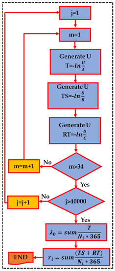 Step 3: there are various methods to calculate the initial values of the annual failure rates, the average switching time, and the average maintenance time of each element of the distribution system. In this paper, the simulation interval was one year, and all sections were the same in terms of reliability. Thus, if a fault occurred in any of the sections, it affected the total reliability of the system. The initial values of the failure rate and maintenance time were modeled using the Monte Carlo method. For this purpose, 40,000 scenarios were considered. In each scenario, the duration of the devices being healthy (T), the time required for switching (ST), and repair time (RT) were specified randomly. In the following, the results were divided by the number of scenarios (40,000) and the number of days of the year to obtain the final failure rate and RT.