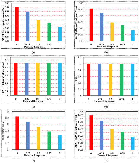 Many distribution systems have open points in their ring structure such that they operate as effective radial systems under natural conditions, but when a fault occurs in a system, some switches are closed, and a number of loads that are interrupted are restored. This property affects DS reliability because other loads that are disconnected until the faulty element is repaired completely are returned to normal conditions during the switching time using these links. Since many distribution system faults occur during peak hours, all disconnected loads cannot be transferred to the side feeders via the normal lines, because the side feeder might be overloaded or because connecting all loads to the side feeder reduces the voltage significantly. In such conditions, the time for which a load point is disconnected, which corresponds to a failure, is equivalent to the isolation time if it can be transferred to the side feeder or equivalent to the maintenance time if it cannot be transferred to the side feeder. The average of these two values specifies the time for which a load is disconnected as a result of a fault. Also, recovering disconnected loads by connecting to the side feeder increases by decreasing energy consumption at peak times, and more loads are thereby recovered [55,56]. Hence, the expected energy-not-supplied index decreases [57].