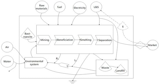 Rare-earth elements (REEs) are considered to be “monosodium glutamate in industry” and are classified as strategic resources due to their crucial uses in the production processes of several key industries. China has the largest known rare earth reserves worldwide. The data in [1] showed that China’s rare earth resource reserves totaled 44 million t at the end of 2018, which accounted for 38% of global rare earth reserves. Light rare-earth elements (LREEs) are mainly concentrated in the north of China, and heavy rare-earth elements (HREEs) are mainly concentrated in the south of China. The three major types of rare-earth minerals are mixed bastnaesite–monazite ore in Baotou, ion-absorbed rare earth deposits in the seven southern provinces, and bastnaesite in Sichuan. The rare earth industry of China has experienced rapid development since the “13th Five-Year Plan”. However, some problems have also emerged, such as the overexploitation of rare earth resources, serious damage to the environment, the irrational layout of the rare earth industry, and the accumulation of smelting and separation wastes. To exploit these resources reasonably and reduce environmental pressures, China has tightened regulations on, and issued standards for, the rare earth industry since 2011. For example, the policies of unified planning and total quota control were released to safeguard rare earth resources and enable their effective utilization. Meanwhile, small plants with serious pollution problems were shut down due to their lack of enterprise compliance. Emissions standards for pollutants from the rare earth industry (GB 26451-2011) were issued and implemented for the purposes of strengthening the prevention and control of pollution, protecting the environment, and facilitating the sustainable and healthy development of the rare earth industry [2]. Since 2014, the National Energy Administration has prohibited the construction of coal gasification projects with annual outputs of two billion cubic meters or less. Therefore, some companies have gradually switched to using natural gas as a fuel. After implementation of the above measures, it remained unclear whether the environmental impacts of the rare earth industry had been improved, which requires further research. Hence, it is necessary for the rare earth industry to select an appropriate systematic method to conduct a complete, scientific, and objective industrial evaluation.