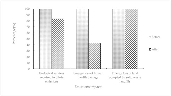 The emergy loss caused by emissions is equal to the sum of and , as shown in Equation (8):