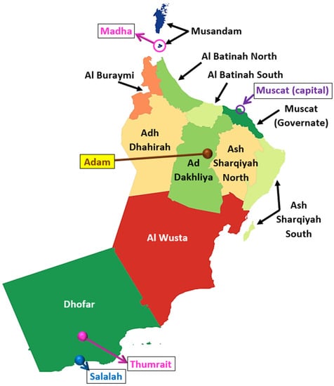 - Oman by region—Foreign Ministry of Oman. Available online: https://fm.gov.om/about-oman/state/oman-by-region (accessed on 22 September 2021).