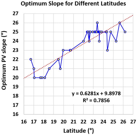 For the analyzed locations, the optimized slope ranges from 20° (in multiple locations) to 26° (in Al Rustaq and in Dibba), with a range of 6°. In relation to this, the latitude angle for the analyzed locations varies from 16.70° (in Dhalkut) to 26.18° (in Khasab), with a range of 9.48°. Figure 2 shows how the slope changes with the latitude for all the analyzed locations. A linear regression model is moderately fitting the data.