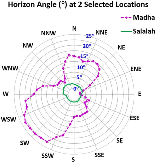 For the optimized PV azimuth, it is at or close to due south, with a small east–west deviation range of 16°. The most east-biased azimuth corresponds to the location of Madha (in Musandam governorate), being 11° toward the east. The most west-biased azimuth corresponds to the location of Salalah (in Dhofar governorate), being 5° toward the west. The profiles of the horizon height (expressed as an angular distance, in degrees) for both locations are compared in Figure 3. The deviation from due south in the case of Salalah is small and can be attributed to small differences in the solar radiation between the morning and the afternoon intervals.