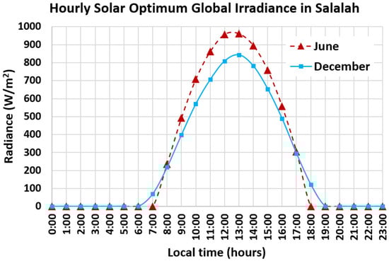 Temporal distribution of calculated hourly solar irradiance for the month of June and the month of December in the location of Salalah, latitude: north 17.015° and longitude: east 54.092222°. The values are obtained using PVGIS Table 2005. Years of data in the database: PVGIS-SARAH.