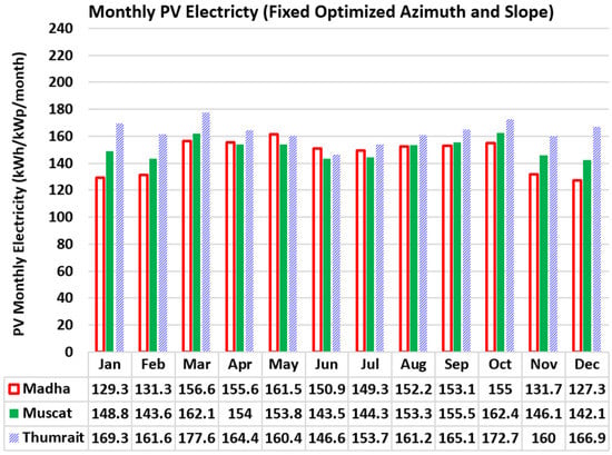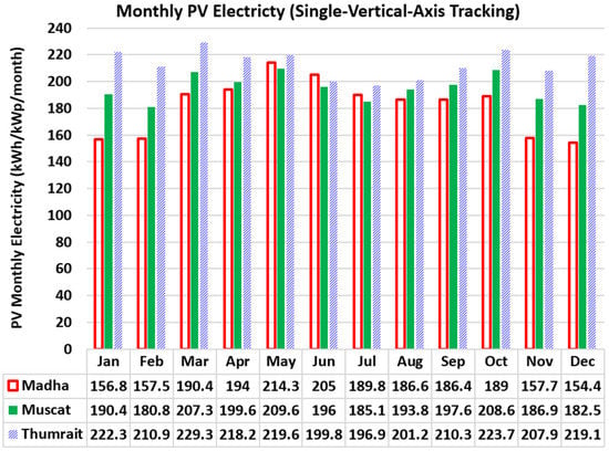 Monthly expected electricity generation from solar PV systems with single-vertical-axis solar tracking in three special locations in the Sultanate of Oman among those analyzed in the current study: (1) Madha (showing the lowest expected electricity generation over the whole year); (2) Muscat (the capital, and the reference location in the current study); (3) Thumrait (showing the highest expected electricity generation over the whole year). Data source: PVGIS ©European Union, 2001–2021.