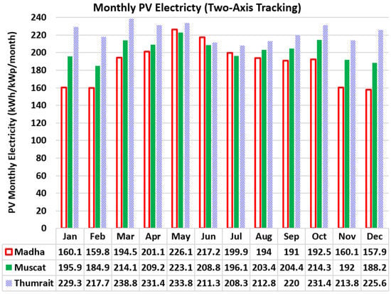 Monthly expected electricity generation from solar PV systems with two-axis solar tracking in three special locations in the Sultanate of Oman among those analyzed in the current study: (1) Madha (showing the lowest expected electricity generation over the whole year); (2) Muscat (the capital, and the reference location in the current study); (3) Thumrait (showing the highest expected electricity generation over the whole year). Data source: PVGIS ©European Union, 2001–2021.