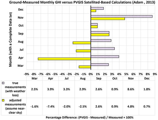 With respect to the true measurements, all the individual monthly percentage differences are positive, which means that the calculated values of GHI exceed the experimental GHI values. Nevertheless, considering all 8 months, the average of the percentage differences is 3.32%, which is relatively small. With respect to the adjusted measurements, half of the individual monthly percentage differences are positive, and the other half is negative. The average of the absolute values of the percentage difference for the 8 months is 2.82%. The individual monthly percentage differences are shown in Figure 8.