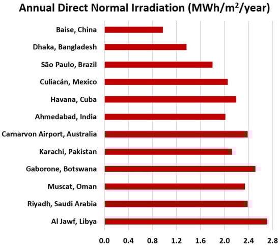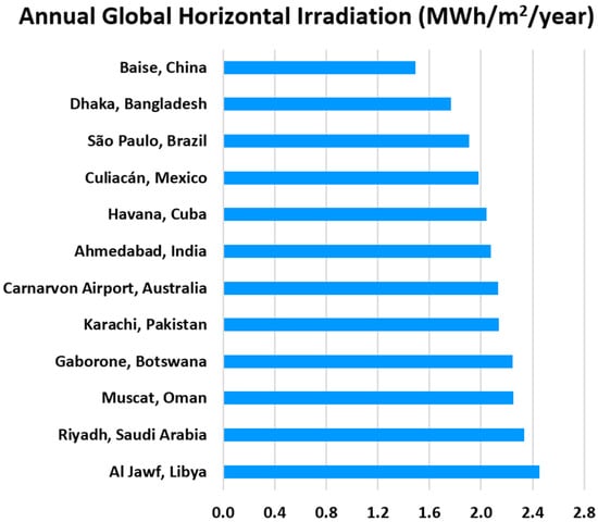 Nearly all the additional foreign locations were analyzed using the PVGIS-SARAH data set (which is the data set used for the 40 wilayats in Oman in the earlier locally focused part of this work) except Culiacán (Mexico) and Havana (the capital of Cuba), where PVGIS-SARAH is not applicable. Instead, the data set of PVGIS-NSRDB was used. PVGIS-NSRDB has a finer spatial resolution than PVGIS-SARAH (latitude × longitude: 0.038° × 0.0.38°, compared to 0.05° × 0.05° for PVGIS-SARAH), but its end year is 2015 (as compared to 2016 for PVGIS-SARAH). The calculated annual GHI and DNI here are for the last year available in the data set, which is either 2016 for PVGIS-SARAH or 2015 for PVGIS-NSRDB.