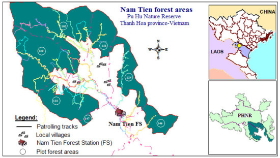 Nam Tien forest station (FS) belongs to Pu Hu NR, which is spread over two districts (Quan Hoa and Muong Lat) in Thanh Hoa province with protection of around 24,000 ha. Pu Hu NR lies in a rugged location (latitude 20°30′ and 20°40′ N, and longitude 104°40′ and 105°05′ E) [23] in the northeast of Vietnam (Figure 1). It was established as a special-use forest area in the year 1999 by the government of Vietnam and is governed by Pu Hu Management Board. Since the establishment of the NR, and under the control of the surrounding forest stations such as Nam Tien FS, all exploitation of forest resources has been forbidden. The extraction of forest resources and other related economic activities by local people in the surrounding areas were monitored by the FS [24].