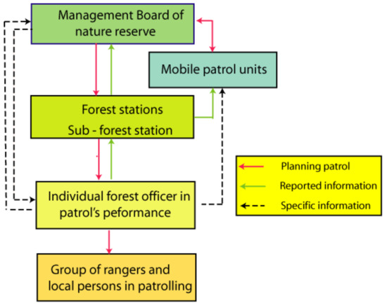 After each patrol, information is recorded and these are tabulated into a summary consisting of Excel worksheets which are submitted to the director of the Pu Hu NR and discussed in monthly meetings. However, in some cases, the information from the patrol rangers has been directly provided as feedback to management to enable them to solve issues on time [29,32] (Figure 2).