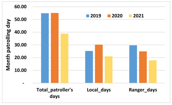 The number of monthly patrolling days by both types of patrollers in 2021 was significantly reduced (38.83 patrolling days/month), compared to the previous two years (around 55 patrolling days/month). In particular, the number of working days in the field by rangers was slightly lower, while the monthly local days in 2020 reached 30.2 patrolling days/month (Figure 3). However, the distribution of average patrolling day by local persons (SD 1.45 ± 0.50) was higher than the rangers’ patrolling (SD 1.38 ± 0.49). The average number of working days, (including forest rangers and local persons), were monthly operating days for patrolling over three years (2019, 2020, and 2021) as follows: 3.11 (SD = 0.68), 2.98 (SD = 0.45), and 2.18 (SD = 0.38) respectively.